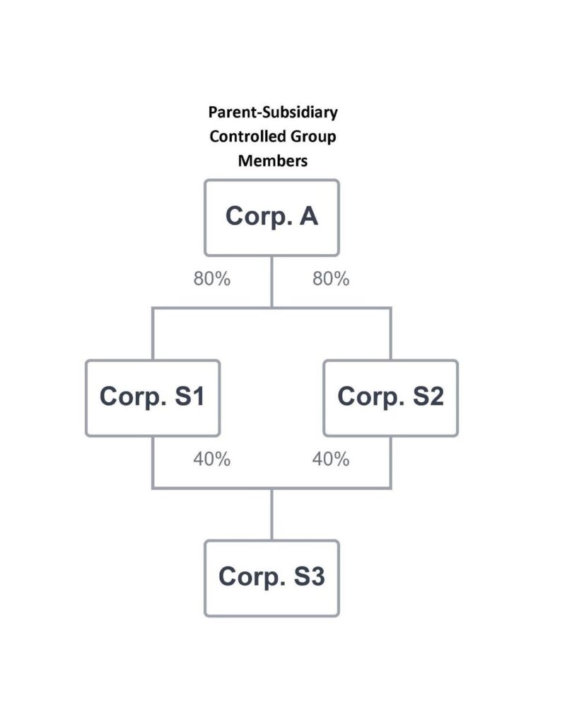 Parent-subsidiary example 2: Corporation A owns 80% of the only class of stock Corporation S1 and of Corporation S2. Corporations S1 and S2 each own 40% of the only class of stock of Corporation S3. Corporation A is the common parent of a parent-subsidiary controlled group consisting of corporations A, S1, S2 and S3 (with the indirect 40% ownership interests of Corporation S3 combined). See diagram below. See also, Treas. Reg. § 1.414(c)-2(e) Ex. 2, and Treas. Reg. § 1.1563-l(a)(2)(ii) Ex. 3.